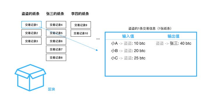 发起交易的时候,发起人会收到一张小纸条,他需要将交易记录比如说“盗盗转账给张三40元”写在纸上。说来也神奇,当写完的那一刹那,在小纸条的背面会自动将这段交易记录格式化成至少包含了“输入值”和“输出值”这两个重要字段;“输入值”用于记录数字货币的有效来源,“输出值”记录着数字货币发往的对象。