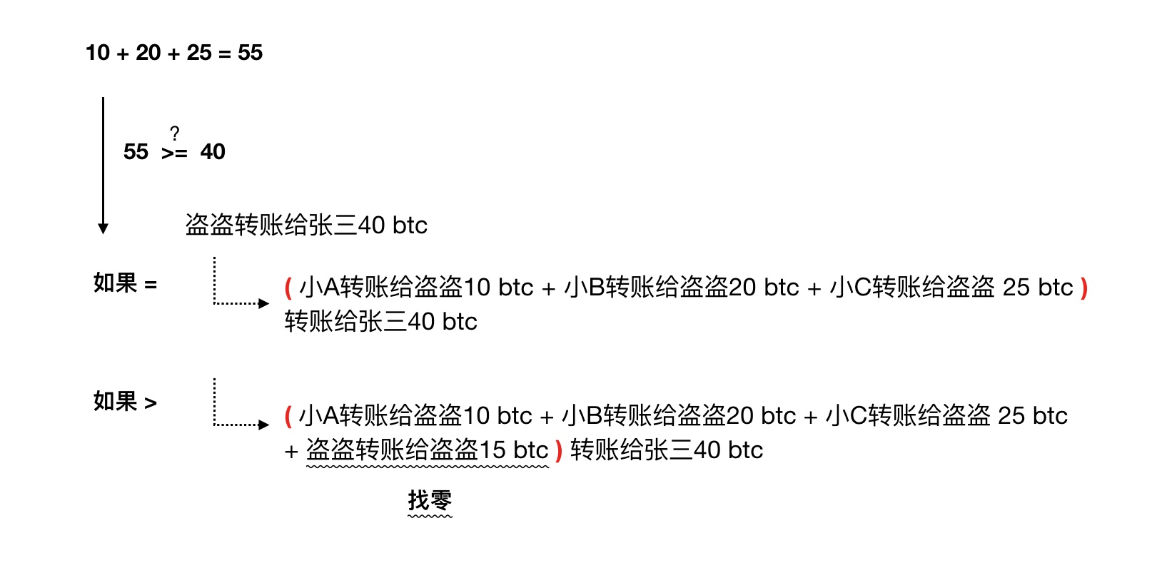 就上图的例子,我们追溯到曾经转账给盗盗的有效交易记录有“小A转账给盗盗10 btc”、“小B转账给盗盗20 btc”、“小C转账给盗盗 25 btc”,我们需要将这三条交易记录合并成一条更复杂描述的交易记录,即 “( 小A转账给盗盗10 btc + 小B转账给盗盗20 btc + 小C转账给盗盗 25 btc ) 转账给张三40 btc ”