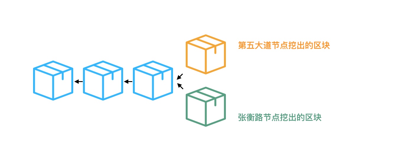 假如几乎同一时间,「中国上海浦东新区张衡路」上的节点和「美国纽约曼哈顿第五大道」上的节点异口同声喊出来:“我挖到区块了!里面的小纸条都是有效的!奖励归我!”。其他节点也几乎同时参与了对这两个区块的校验,结果发现这俩都没毛病,各节点也开始犯困,因为在他们的视野里他们并不清楚最后哪一个区块应该会被主链接纳。算了!都连在自己区块链尾巴上吧,这时尴尬了,区块链硬生生的被分叉了!