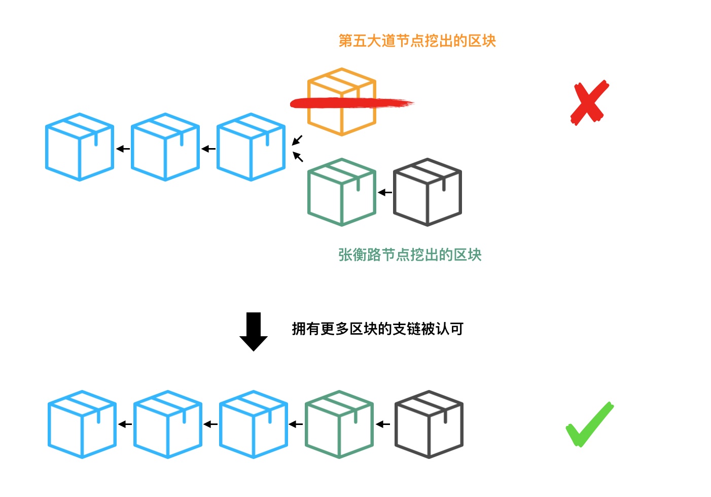 就上图而言,所有基于张衡路节点挖矿获得的区块以及后续区块的那条分支被视为有价值,最终会全部保留了下来;其他节点会统一效仿那个拥有更长分支链的节点所做的决策。另外,值得一提的是,同一时间,较短分支上的区块会立即丢弃,而里面的小纸条也会随之释放出来,被重新标记上“未确认”。