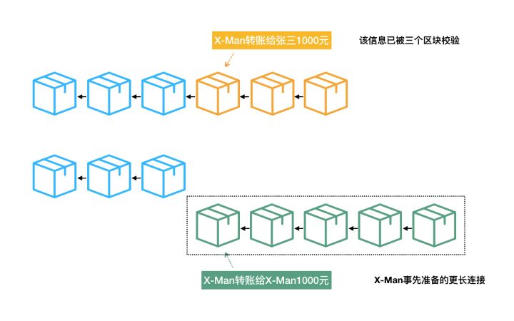 大功告成,X-Man拥有了一条更长的区块链条,那些较短、存放着“X-Man转账给张三1000元”的区块链,以及在区块链世界里那则真实转账行为被一同成功销毁。(?)