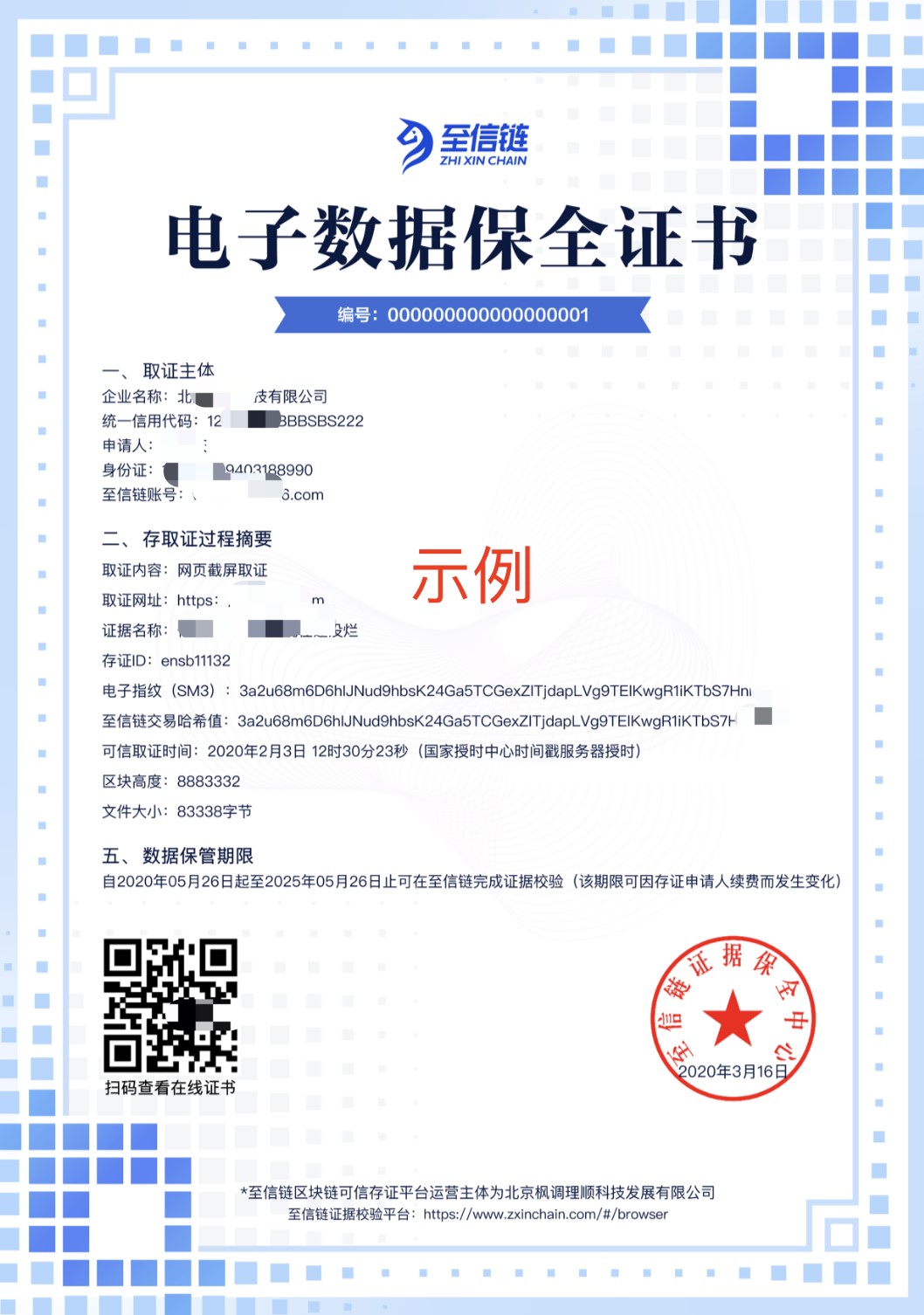 据了解,至信链是基于腾讯云区块链底层技术打造的司法区块链应用生态服务平台。作者在腾讯内容开放平台(企鹅号)上发表原创内容时即可实现“发表即上链”,第一时间在区块链这一不可篡改系统上固化作者对文章的权利关系,上链存证后作者可获取到至信链出具的电子存证证书。上链权属证据将实时同步到“至信链”的多家公信力机构节点如司法鉴定中心、公证处、版权协会等机构。