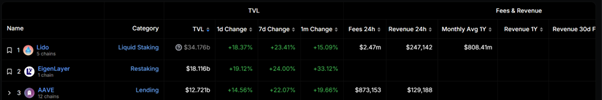 近年来,随着FTX暴雷事件后对中心化交易所的信任危机,DeFi获得了不同以往的关注度,即便在熊市和牛熊交替的横盘时期,也始终扮演加密领域的重要增长角色。DeFi生态涵盖了货币发行、货币交易、借贷、资产交易、投融资等各个链上金融服务功能。其中,DeFi借贷是DeFi的基石,解决了用户抵押杠杆、被动收入以及代币激励的需求。据DefiLlama最新数据,截至2024年5月21日,DeFi借贷协议TVL总量为$36.116b,占比DeFi赛道$105.196b TVL的34%,仅次于TVL $55.717b的流动性质押赛道。其中, DeFi 借貸賽道前三的 Aave, JustLend 以及 Spark,TVL 分別達到$12.721b,$6.824b以及 $2.706b。