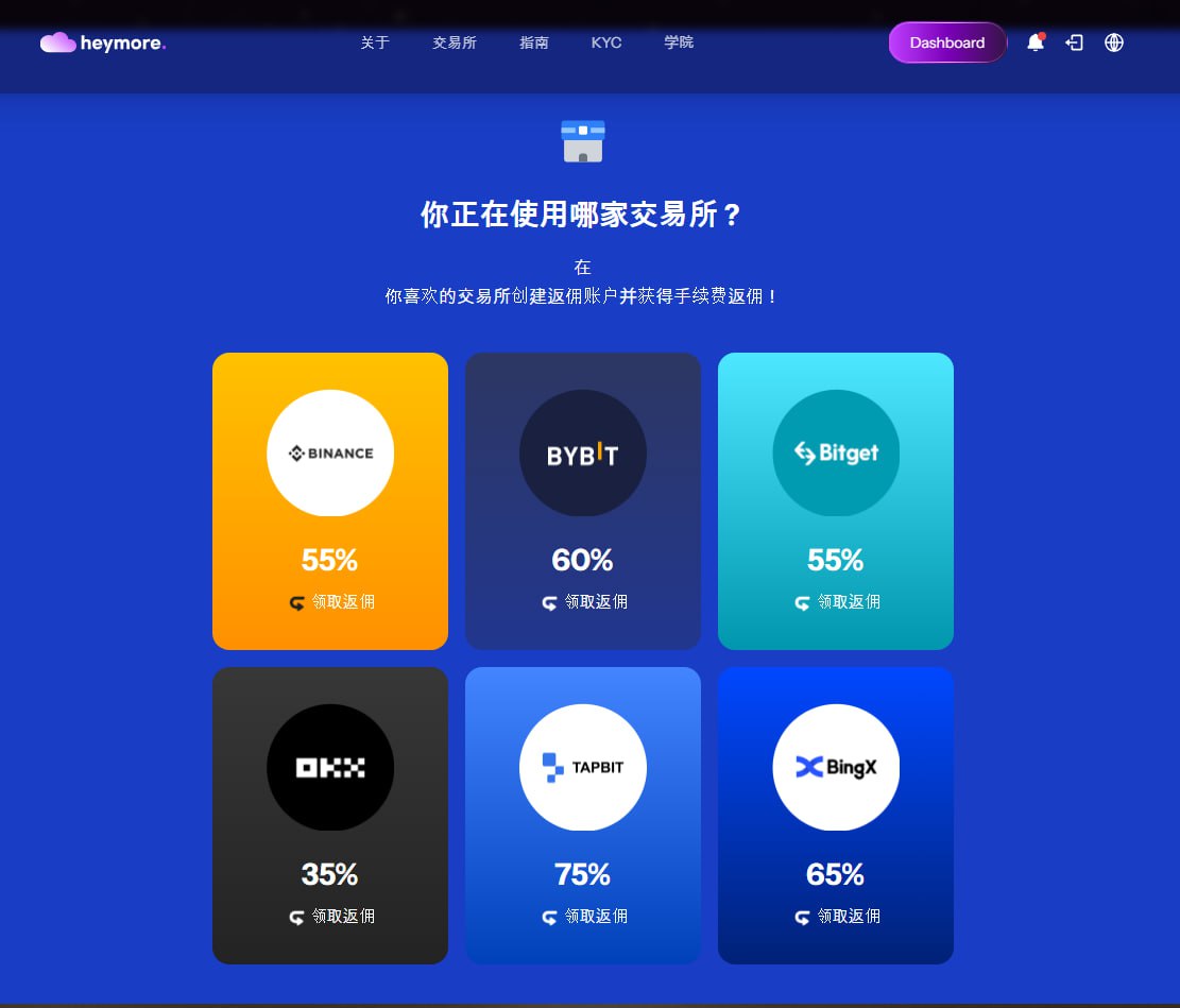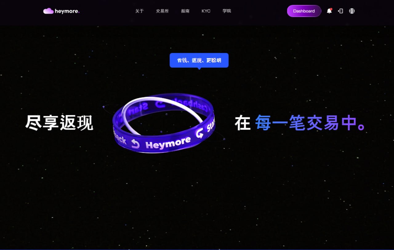 黑摩尔(Heymore,官网:heymore.io)是一家专注于加密交易手续费返佣的平台。通过它的链接注册交易所之后,你每笔交易产生的手续费,平台会按比例永久返还给你。
